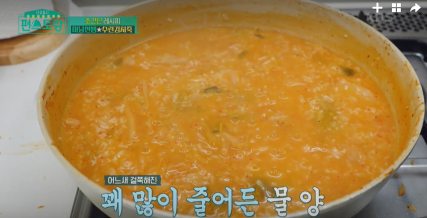 김치찜 끓이는 동안 류수영은 김치죽도 함께 선보였는데요. 아침식사로도 너무 좋을것 같은 김치죽이예요.