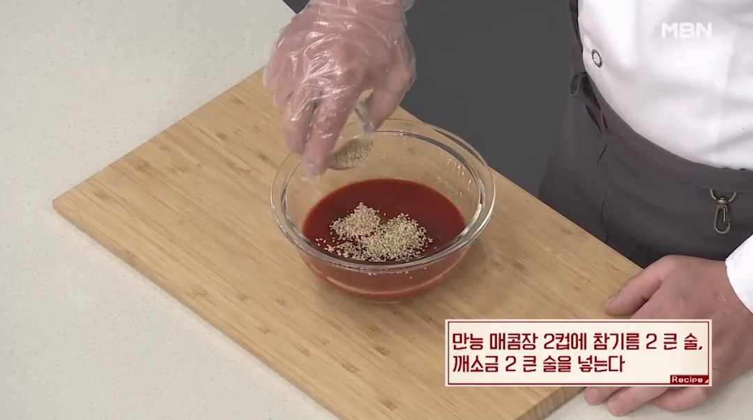 7. 만능 매콤장 2컵에 참기름2큰술, 깨소금2큰술을 넣는다.