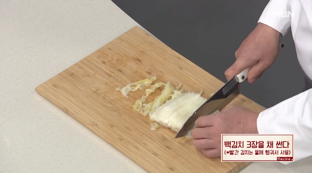 1. 백김치 3장을 채썬다 (빨간 김치는 물에 헹궈서 사용)