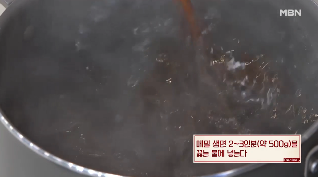 3. 메밀 생면 2~3인분(약500g)을 끓는 물에 넣는다.