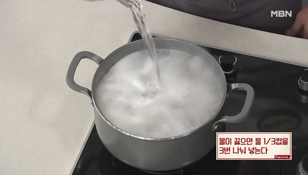 4. 물이 끓으면 물1/3컵을 3번 나눠 넣는다.