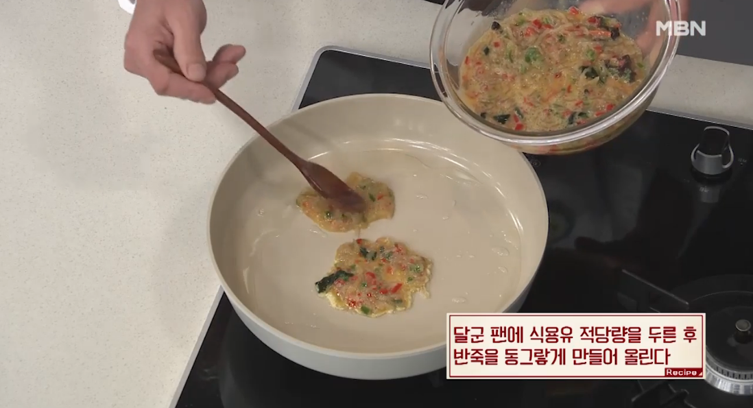 4. 달군 팬에 식용유 적당량을 두른 후, 반죽을 동그랗게 만들어 올린다.