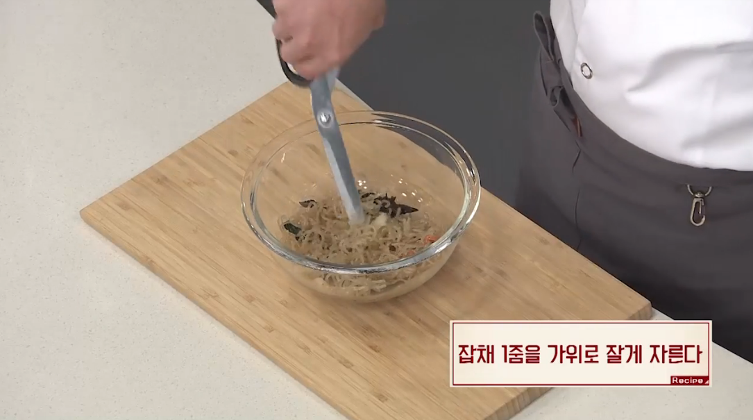 1. 잡채1줌을 가위로 잘게 자른다.